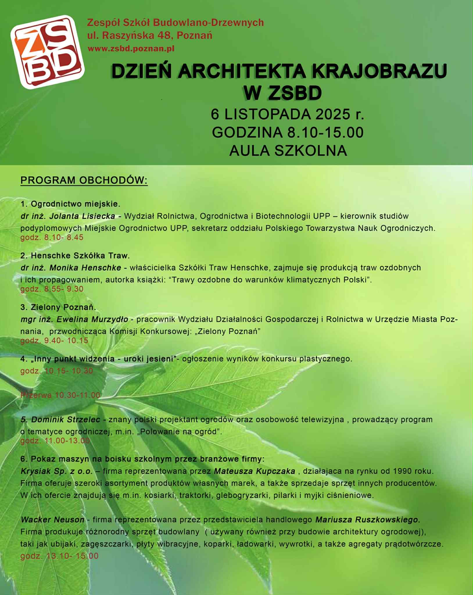 Z radością ogłaszamy, że w przyszły czwartek w naszej szkole odbędzie się wyjątkowe wydarzenie - Dzień Architekta Krajobrazu. Będzie to okazja aby zdobyć motywację do rozwijania własnych umiejętności i pasji. Kiedy? : 6 listopad 2025 r. Gdzie? : aula szkolna ZSBD Start : godz. 8.00