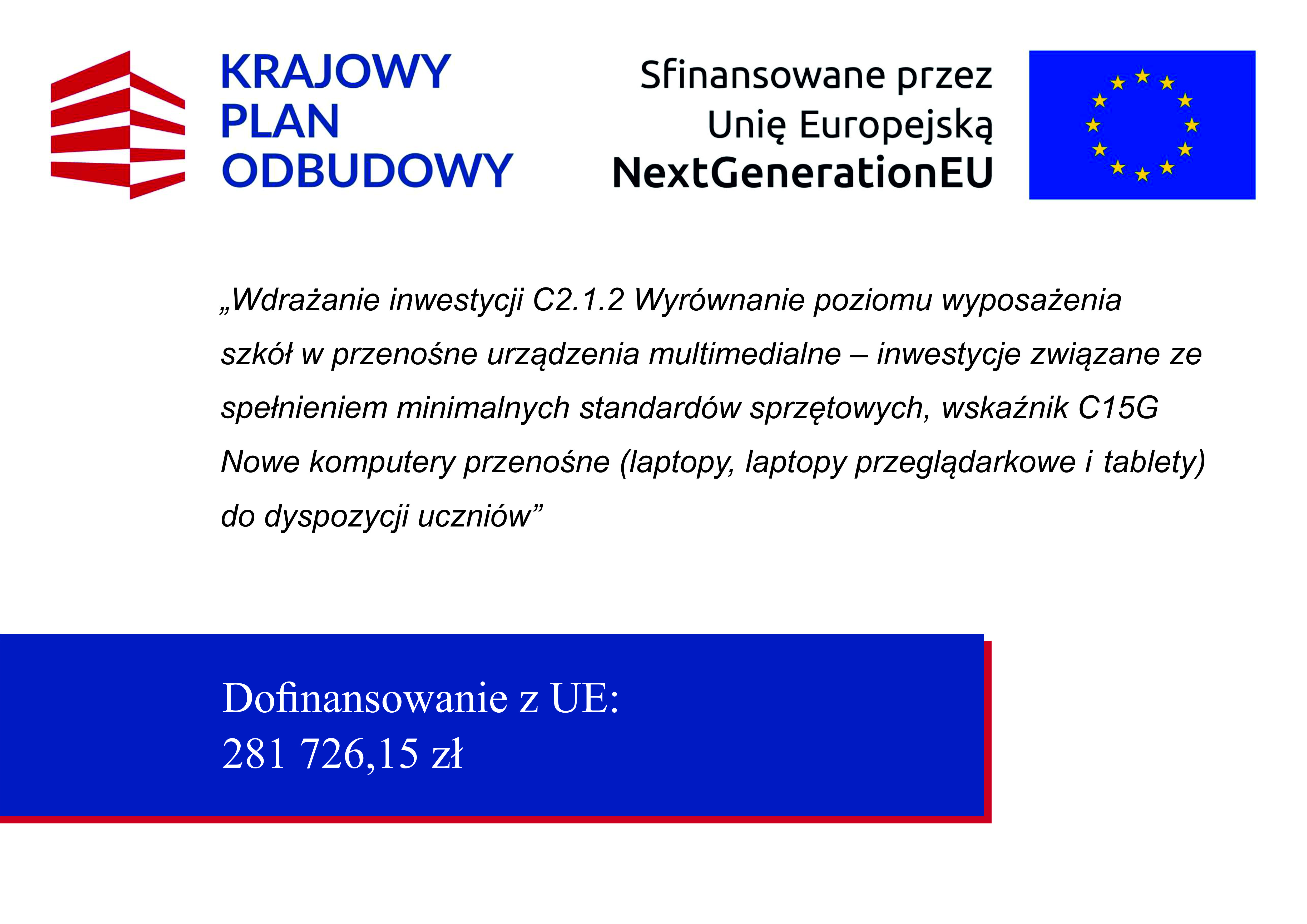 Nasza szkoła realizuje przedsięwzięcie w ramach Krajowego Planu Odbudowy, finansowanego ze środków Unii Europejskiej, którego celem jest doposażenie placówek w nowoczesny sprzęt multimedialny. W ramach inwestycji szkoła została wyposażona w nowe komputery przenośne oraz tablety, które będą wykorzystywane w procesie dydaktycznym. Dzięki realizacji projektu uczniowie zyskują lepszy dostęp do narzędzi edukacyjnych, co przekłada się na podniesienie jakości kształcenia oraz wyrównywanie szans edukacyjnych. Wartość dofinansowania: 281 726,15 zł