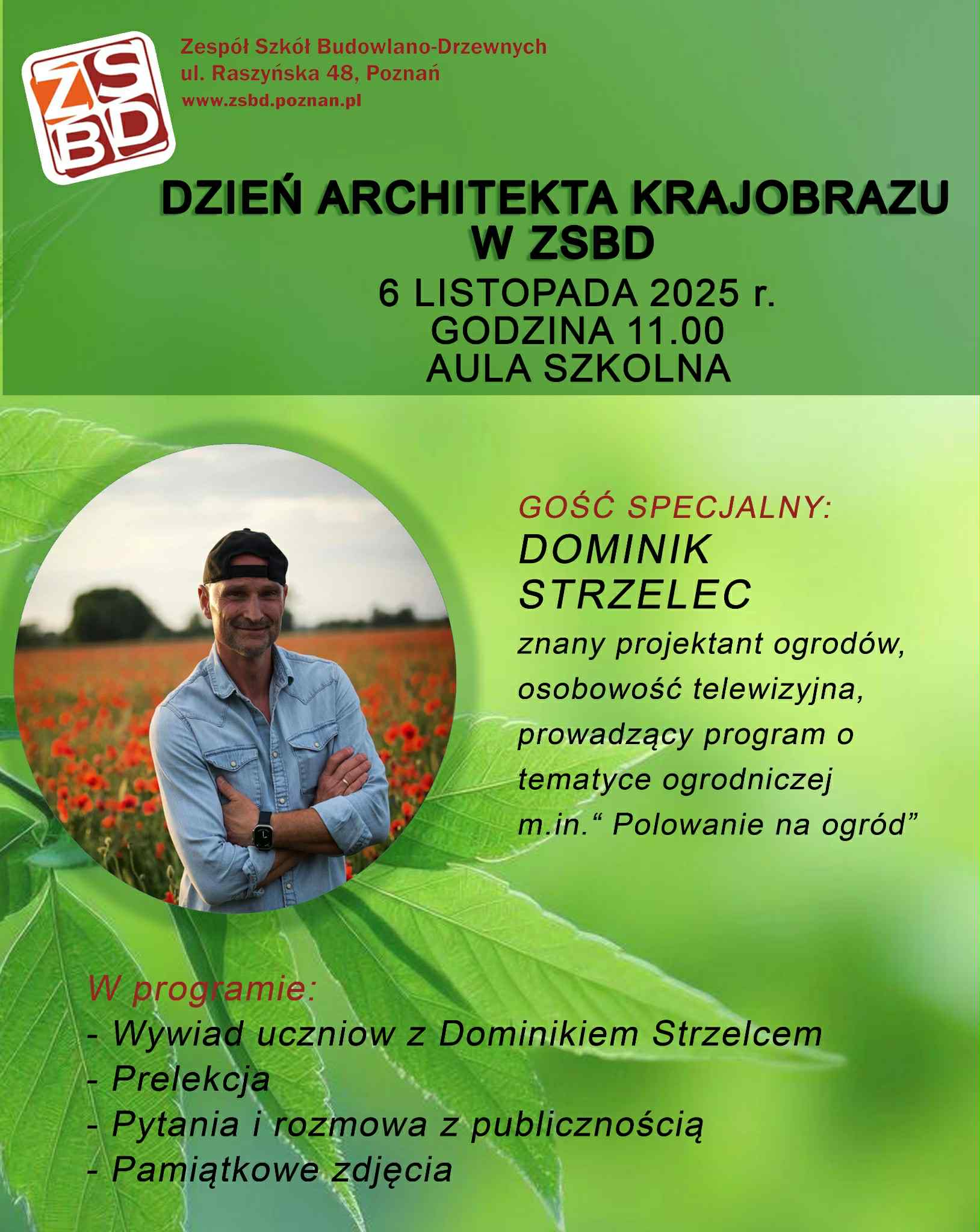 Z radością ogłaszamy, że w przyszły czwartek w naszej szkole odbędzie się wyjątkowe wydarzenie - Dzień Architekta Krajobrazu. Będzie to okazja aby zdobyć motywację do rozwijania własnych umiejętności i pasji. Kiedy? : 6 listopad 2025 r. Gdzie? : aula szkolna ZSBD Start : godz. 8.00